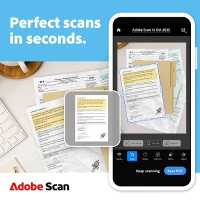 Adobe Scan آپ کے موبائل ڈیوائس کو ایک طاقتور اور پیشہ ورانہ دستاویز سکینر میں بدل دیتا ہے، جس سے آپ کوغذی مواد کو ڈیجیٹل شکل میں محفوظ کرنے اور منظم کرنے میں مدد ملتی ہے۔ اب مڑے ہوئے یا ترچھے صفحات کی فکر نہیں! اس کی جدید سیدھا کرنے والی خصوصیت ہر سکین کو خود بخود بالکل درست کر دیتی ہے، تاکہ آپ کی بنائی گئی تمام PDF فائلیں صاف ستھری اور پیشہ ورانہ نظر آئیں، بغیر کسی اضافی محنت کے۔ یہ آپ کی جیب میں ایک مکمل دستاویز سکینر ہے جو آپ کے کاغذی کام کو بے عیب ڈیجیٹل فارمیٹ میں ڈھال دیتا ہے۔