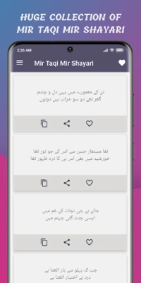 "Mir Taqi Mir Shayari" کے ساتھ اپنے ادبی تجربے کو ذاتی نوعیت دیں۔ اپنی پسندیدہ غزلوں اور اشعار کو ایک جگہ جمع کرکے ایک خصوصی مجموعہ بنائیں۔ یہ مجموعہ آپ کے لیے تحریک کا ذریعہ بنے گا اور جب بھی آپ کو سکون کی تلاش ہو، آپ ان خوبصورت الفاظ کی دنیا میں پناہ لے سکیں گے۔ اس ایپلی کیشن کا ڈیزائن انتہائی سادہ مگر دلکش ہے، جو نہ صرف آپ کے مطالعے کو پرلطف بناتا ہے بلکہ میر کے الفاظ کی گہرائی اور خوبصورتی کو بھی پوری طرح نمایاں کرتا ہے۔
